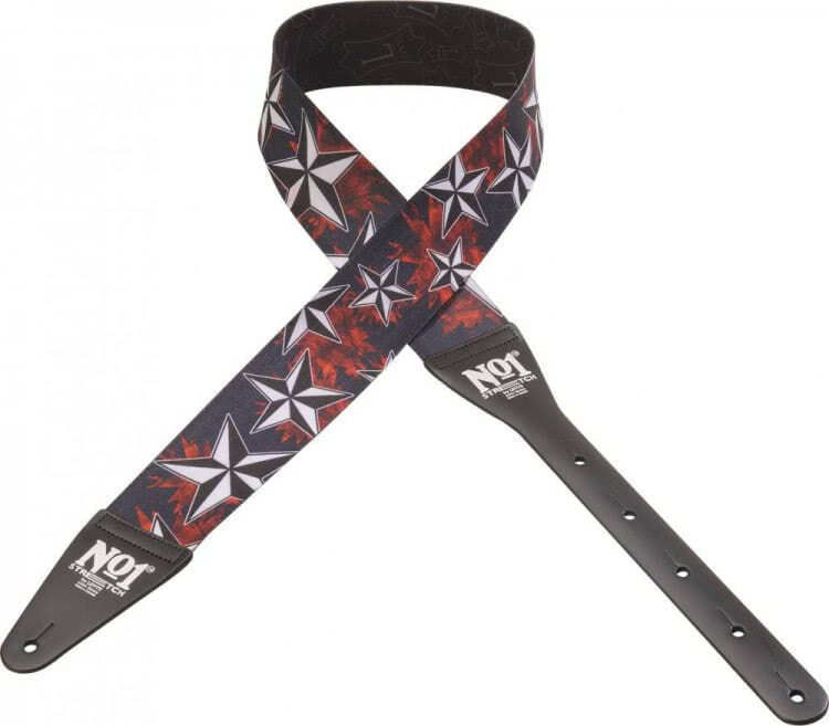 Levy's MNO1P 001 Ремень для гитары, растягивающийся, ширина 6,25см, печатный рисунок красно-черный звезды, кожанные наконечники, длина 109 -130см