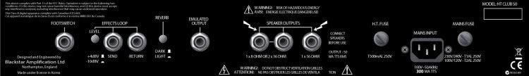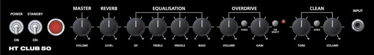HT CLUB 50 HEAD имеет в наличии два канала усиления, Чистый канал (Clean) и канал Перегрузки (Overdrive). Используя ручку Gain на канале Clean, Вы можете перейти от чистого звучания к crunch звучанию. Альтернативно Вы можете выбрать канал Overdrive и снова используя ручку Gain, измененять звучание от чистого звука к искаженному свинцовому тону.