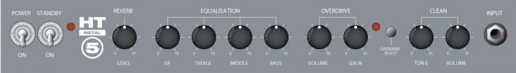 HT-METAL 5 Head имеет в наличии два канала усиления, Чистый канал (Clean) и канал Перегрузки (Overdrive). Используя ручку Gain на канале Clean, Вы можете перейти от чистого звучания к crunch звучанию. Альтернативно Вы можете выбрать канал Overdrive и снова используя ручку Gain, измененять звучание от чистого звука к искаженному свинцовому тону.