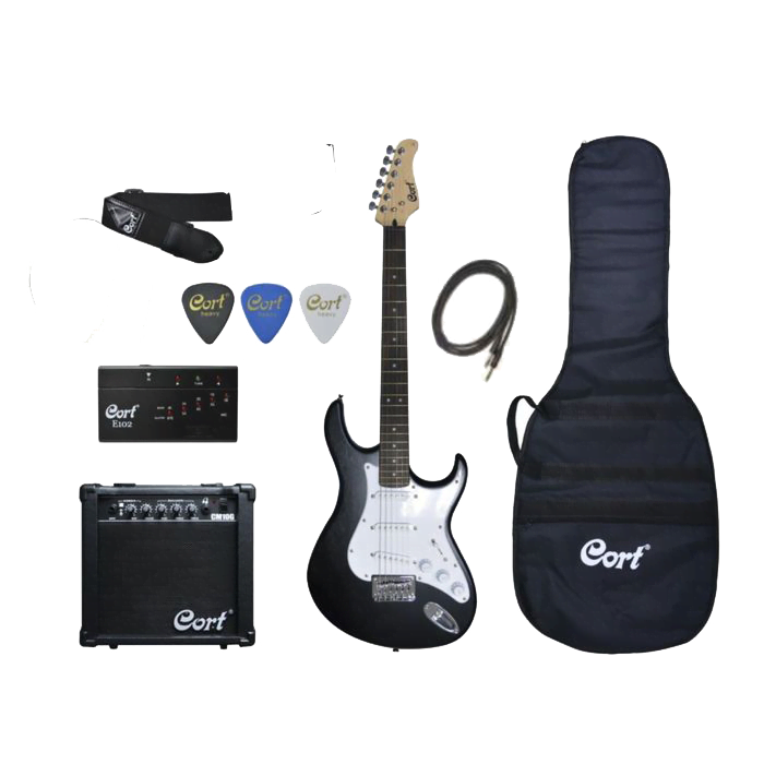 Компания Cort выпускает наборы для гитаристов. В такие наборы включено все, что может понадобится для начинающих музыкантов. Для комплектов с электрическими гитарами, как правило подбирается комбоусилитель, кабель подключения к нему, гитарный ремень, тюнер и медиаторы. Все это позволяет начать играть, сразу после распоковки комплекта. Комбоусилитель этого комплекта имеет мощность 10 ватт, что вполне достаточно для домашних занятий, а так же не сильно будет мешать соседям.