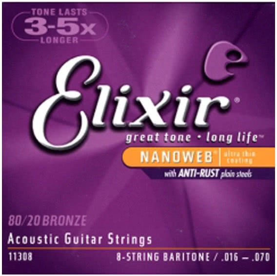 Elixir 11308 80/20 Bronze NanoWeb струны для 8-струнной акустической гитары, толщина .016 - .070, Medium, Baritone