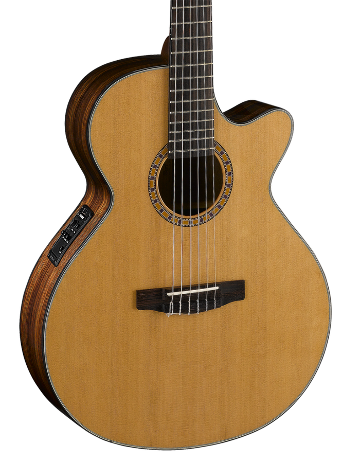 Корпус имеет форму SFX. Верхняя дека гитары CEC7 NAT из цельного красного кедра, нижняя дека и обечайка из палисандра, что характерно только для акустических гитар профессионального уровня. Система связей деки выполнена по традиционной технологии классических гитар, что беспечивает легкое звучание с усилением низких частот.